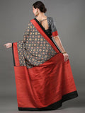 The elegant design is beautifully contrasted by a bold red and black pallu and border, adorned with traditional woven patterns that add richness and depth.