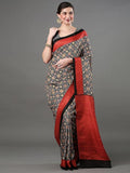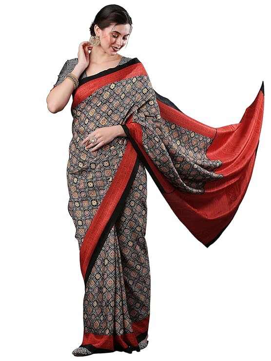Elevate your ethnic wardrobe with this stunning Ajrakh-inspired saree, featuring an intricate all-over geometric and floral print in earthy tones of beige, rust, and black.