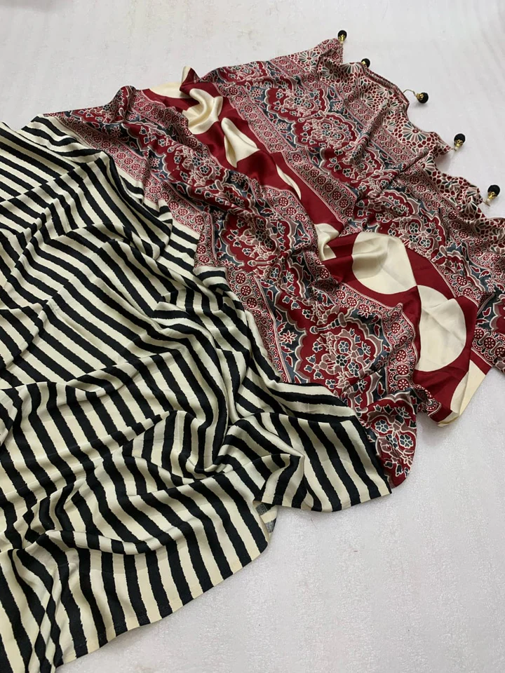 Elevate your wardrobe with the Modal Silk Ajrakh Natural Printed Saree. Crafted from luxurious red modal silk, this saree features exquisite Ajrakh natural prints that blend traditional artistry with contemporary style. Its lightweight fabric ensures effortless draping, allowing you to achieve a polished look quickly and comfortably. Perfect for those who appreciate expert craftsmanship and modern elegance in one graceful ensemble.