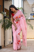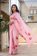 Step into elegance with this soft pink cotton saree, delicately adorned with vibrant hand-painted floral motifs in shades of red, orange, and yellow.