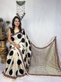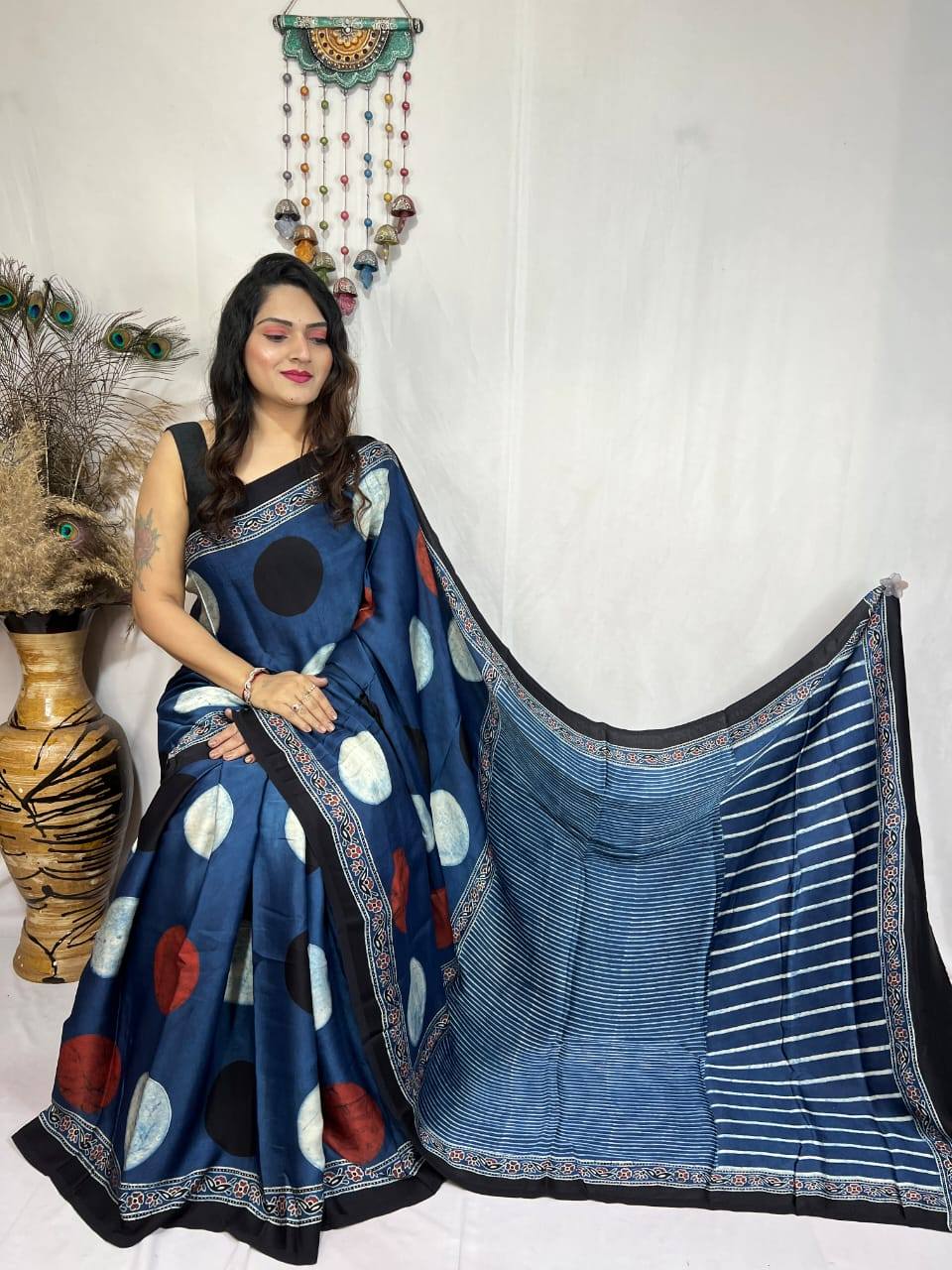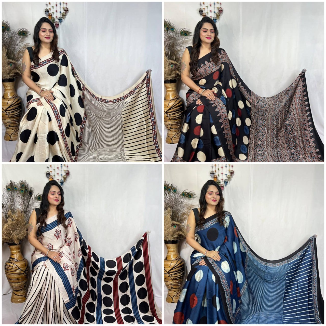 Each saree is beautifully adorned with traditional Ajrakh block prints enhanced by bold polka dot patterns, creating a perfect balance between classic and modern aesthetics.