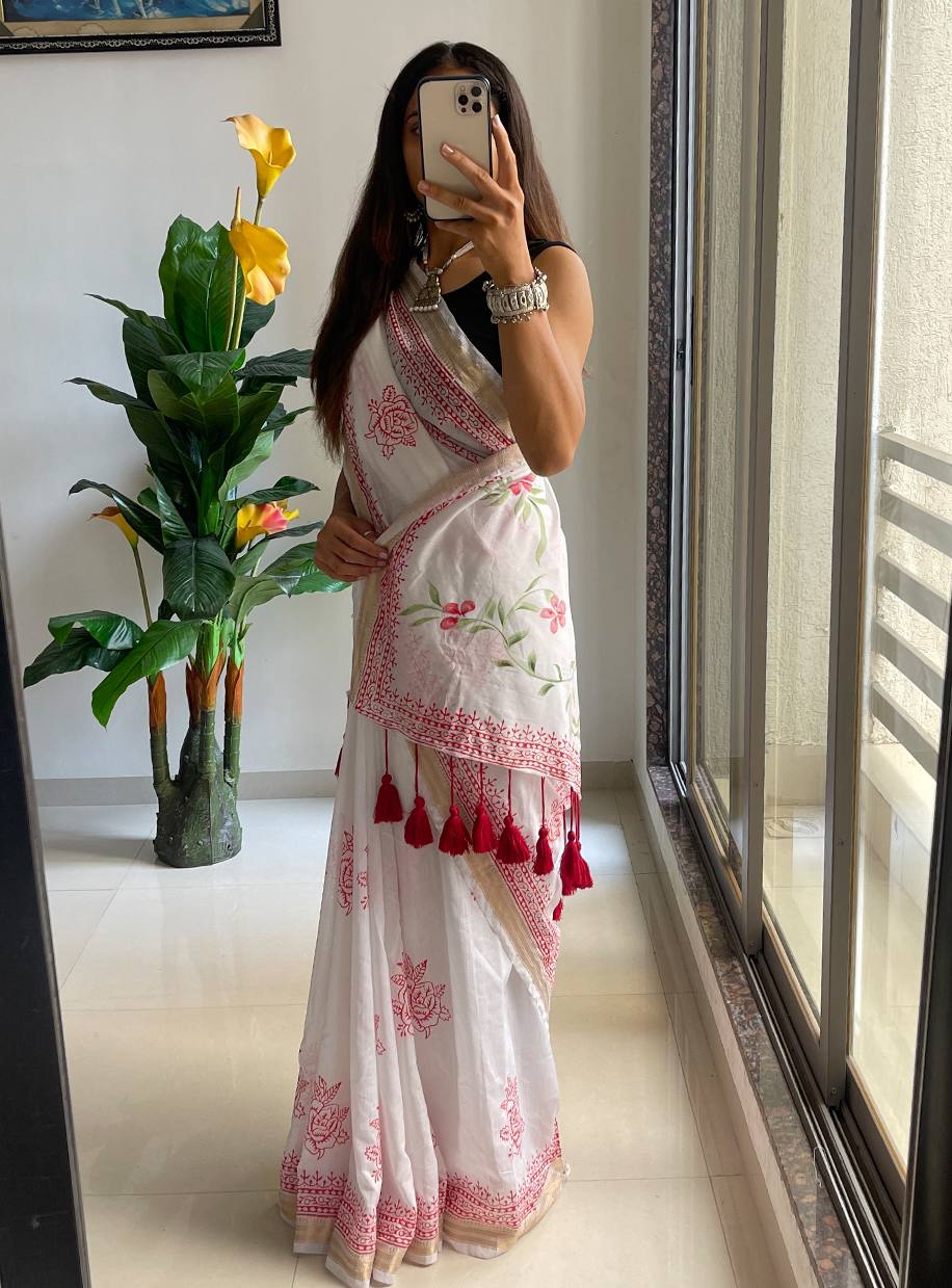 "Classic White Saree With Red Prints And Tassel Detailing"