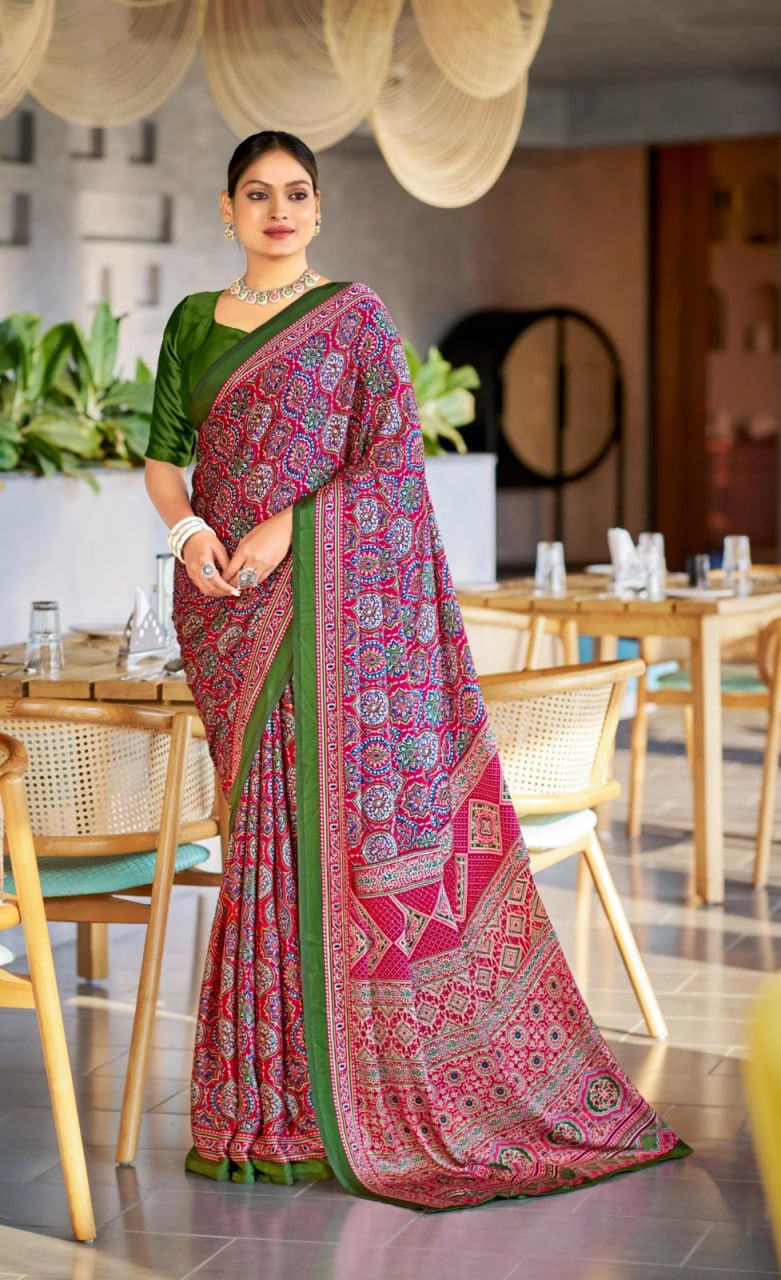 The saree is paired with a solid red blouse that complements the intricate prints, making it ideal for festive occasions, cultural gatherings, or elegant evening events.