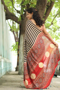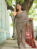 Step into timeless elegance with this beautifully crafted Ajrakh Modal Silk Saree, featuring a striking combination of bold black and beige stripes that exude modern charm.