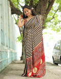 "Elegant Black and Beige Striped Modal Silk Saree with Traditional Ajrakh Print"