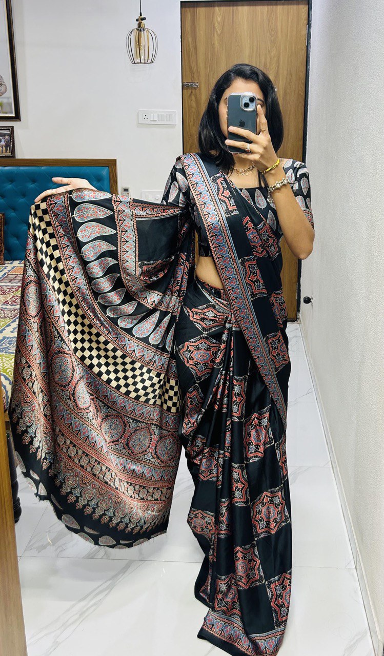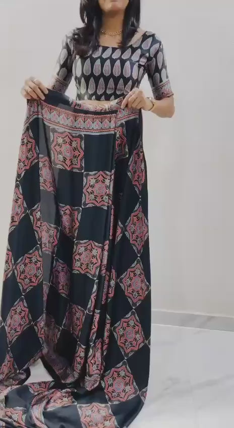 Drape yourself in timeless elegance with this stunning black ready-to-wear saree featuring intricate ethnic motifs in shades of red, beige, and muted blue.