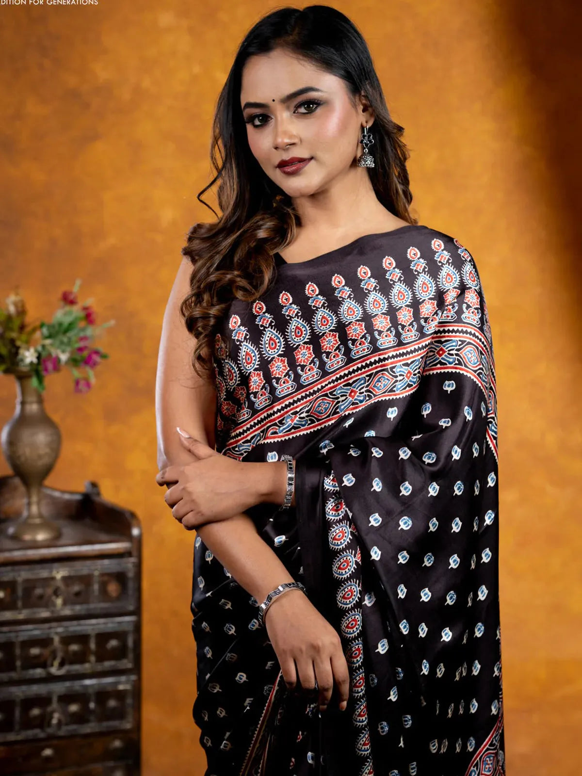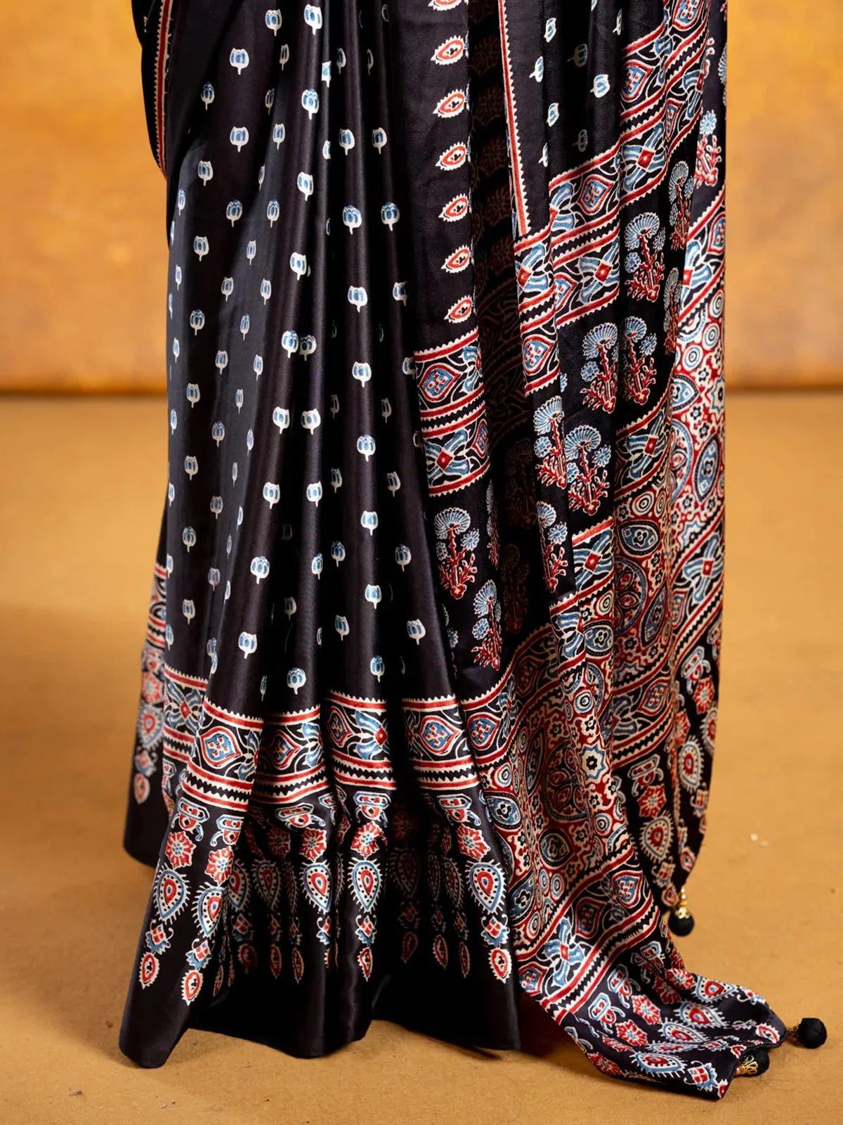 "Eternal Black Beauty Handcrafted Ajrakh Inspired Silk Saree"
