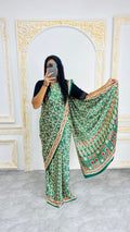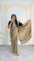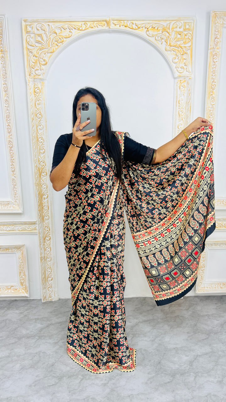 Saree work : Digital Print Border with Ajrakh Rich Pallu With Contrast Blouse