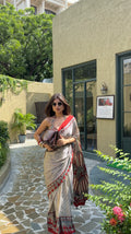 Step into effortless elegance with this beautifully crafted saree, featuring subtle ivory stripes paired with a striking red border.