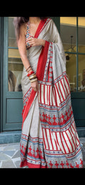 Perfect for brunch outings, festive gatherings, or daytime events, this saree blends minimal style with a bold red accent that instantly stands out.