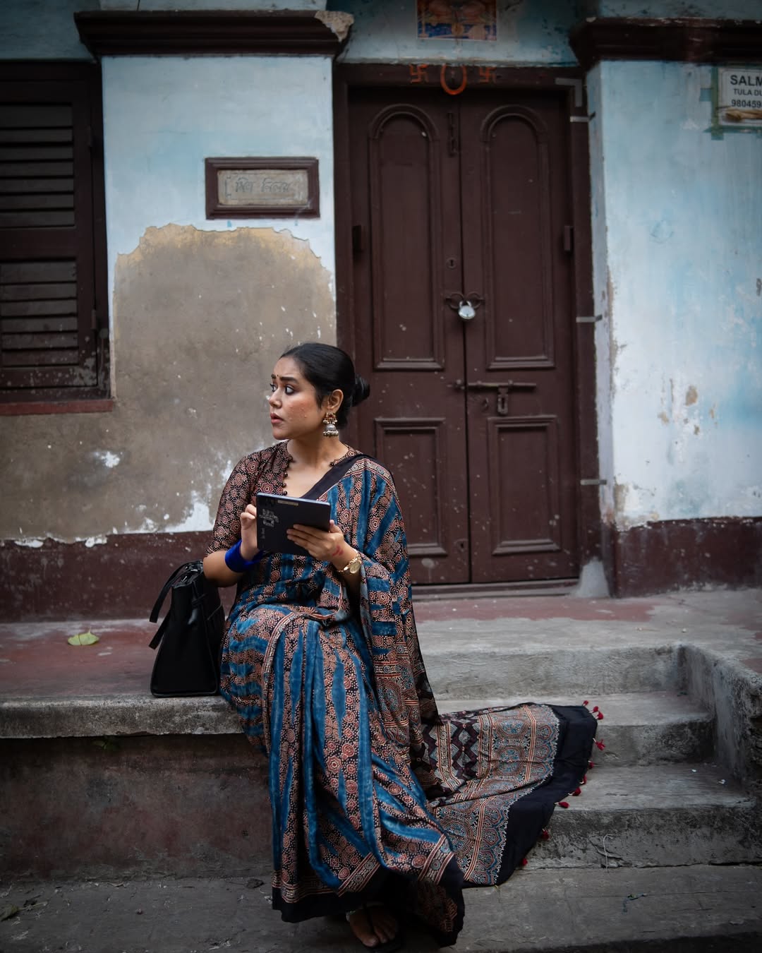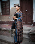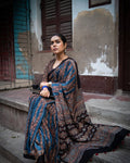 Step into timeless elegance with this stunning rust–blue Ajrakh-inspired saree, crafted with intricate traditional motifs and rich earthy tones.
