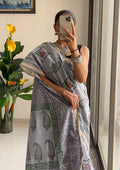 This saree is a light grey cotton or linen fabric featuring a traditional hand-block printed design.Â