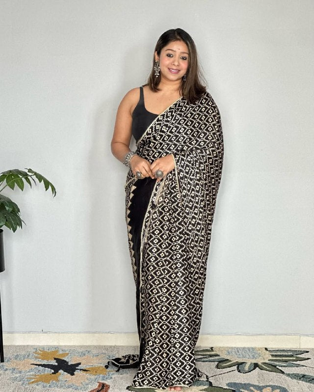 These sarees feature intricate Ikat-inspired patterns, meticulously printed on soft, flowy fabric that offers unmatched comfort and charm.