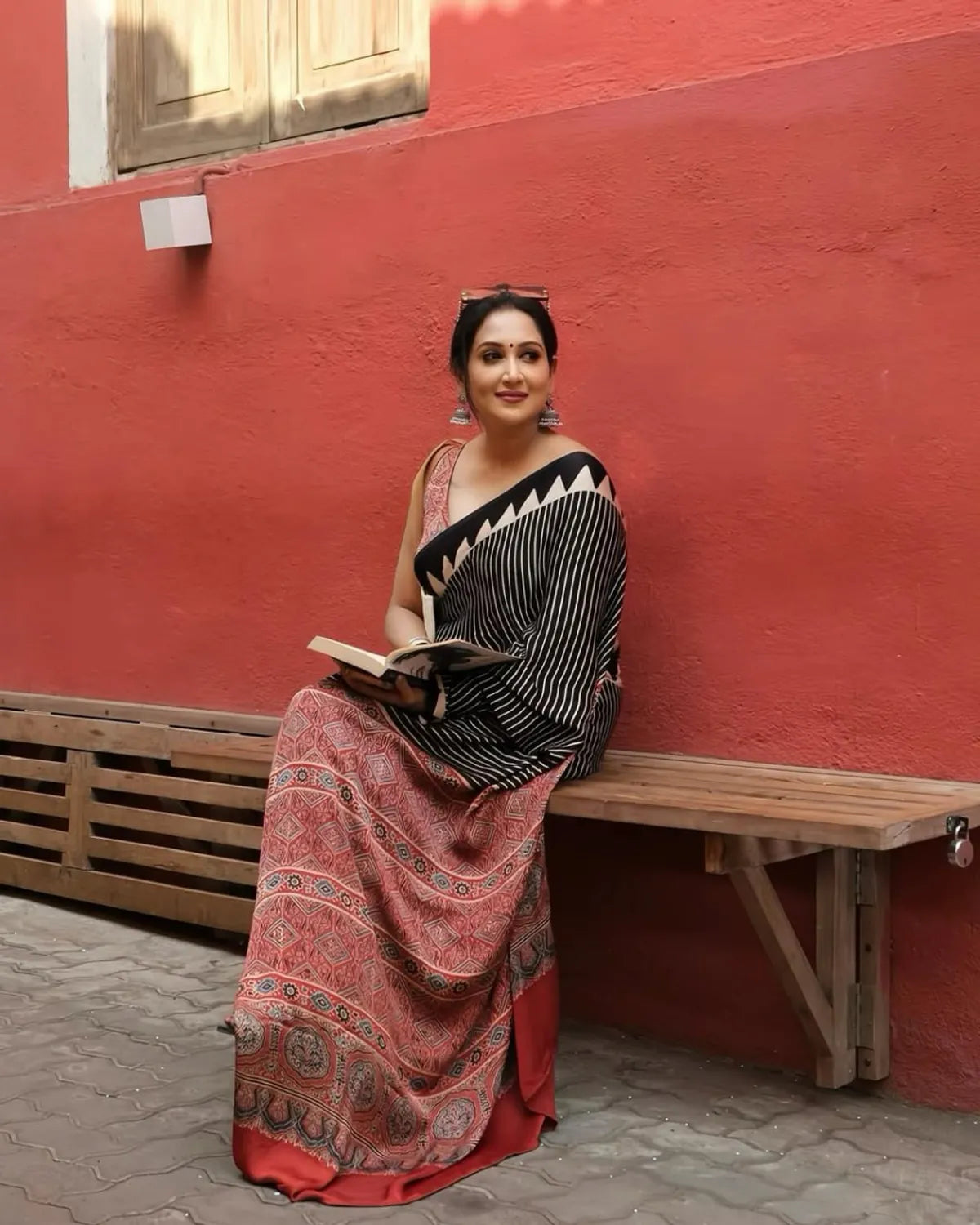 The standout detail is the vibrant Ajrakh pallu in rich red tones, adorned with traditional motifs that add a dramatic and artistic flair.